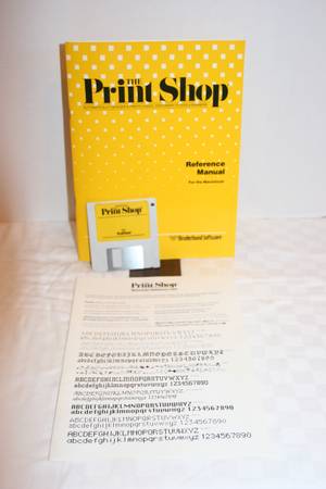 Includes manual, one 3.5” floppy disk, font reference guide and graphics index/inventory, and small amount of yellow tractor-fed paper and envelopes. Software is designed to prepare greeting cards, banners, signs, invitations, etc. Select art from the program or use MacPaint files. Made by Borderbund Software