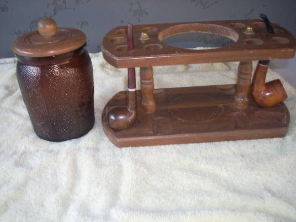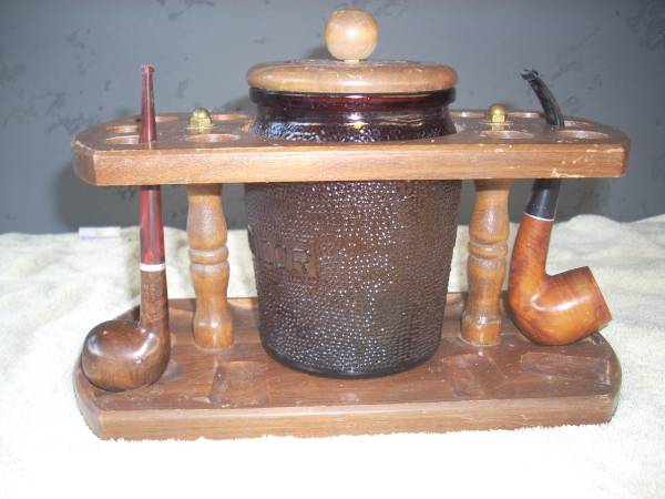 Vintage walnut pipe stand with glass tobacco humidor Hold 12 pipes Good condition Can be used to store cigars or tobacco $40