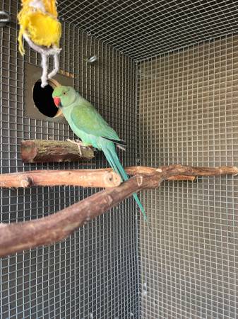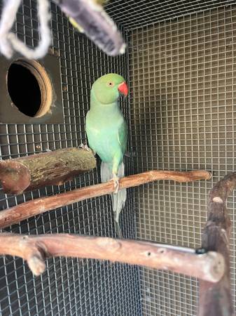Looking for new home, turquoise indian ringneck female, about 2 year’s old, talks some, was hand fed, semi-tame, in good feathers, serious inquiries only