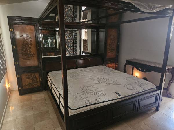Selling a solid unique bed set, cost over $10,000 when new. Solid cherry wood, Asian design. Bedroom set is at least 30 years old.