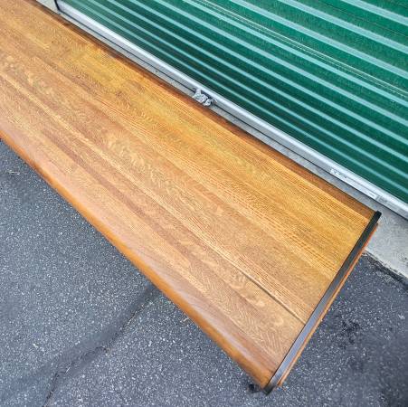 This is solid wood and is very heavy. There are some signs of vintage wear such as on the metal legs, top, and some slight water damage to the backing.