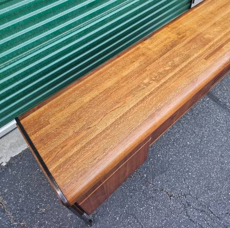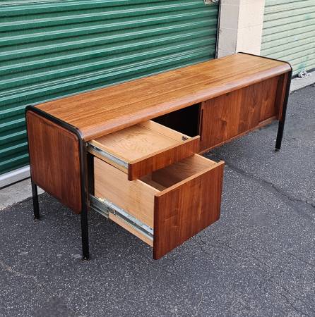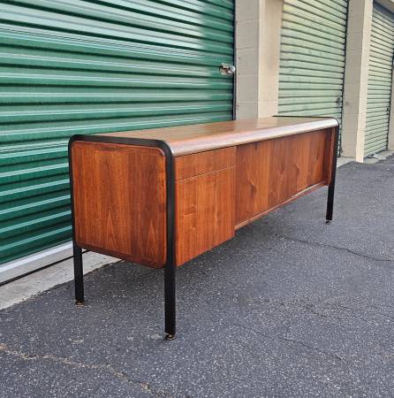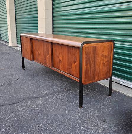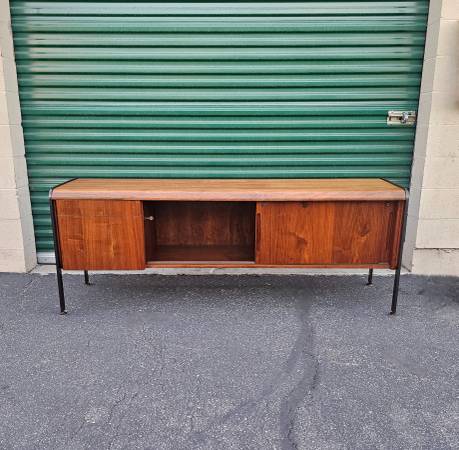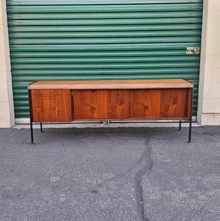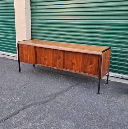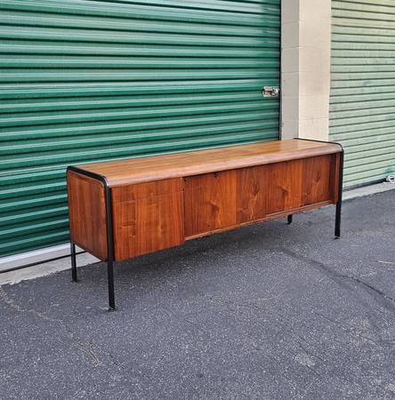 Add a touch of sculptural design to your home with this vintage 1960s Norman Bates credenza featuring walnut sides & front, rounded waterfall edges, and uniquely integrated metal legs. The butcher block top offers plenty of surface space, while the two drawers and interior cabinet provided concealed storage. Behind the sliding doors you can store records, making this the perfect media console; additionally, this has the original key and can be locked to secure any valuables. The minimalist, yet eye-catching design of this goes with a variety of décor like Mid Century, Industrial, Danish/Scandinavian, or Eclectic.