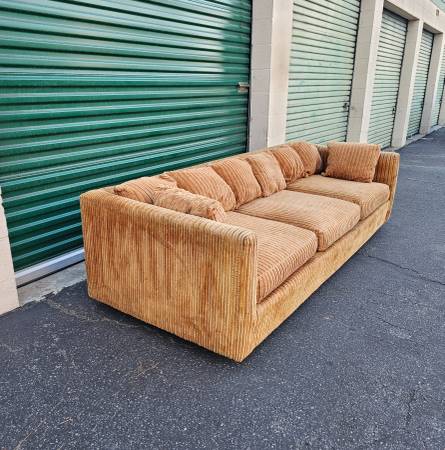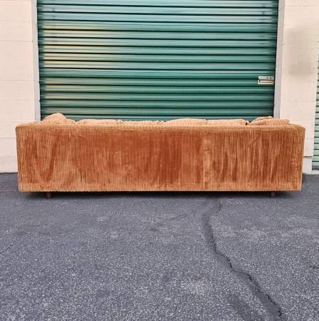 Featuring a classic low profile silhouette and rich cognac brown coloring, this vintage 1970s sofa retains its original stripped velvet fabric giving it a fun retro look that compliments a variety of decors like Mid Century, Danish/Scandinavian, Eclectic, or Minimalist.