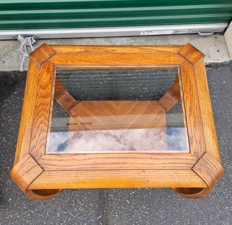 Vintage from the 1970s, this side table set features glass inserts, a warm oak bentwood frame, and bottom shelf. The bold architectural design makes these perfect for adding visual intrigue, while the open silhouette and clear tabletops bring a lightness to any space. One table is square shaped, while the other one is rectangular, and the minimal, yet striking look of these end tables compliments décor styles like Retro, Postmodern, Mid Century, or even Boho.
