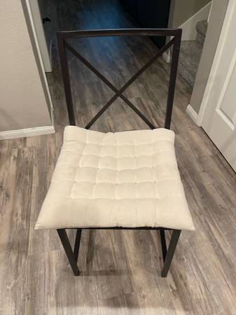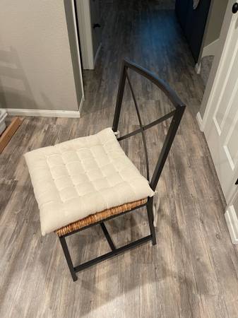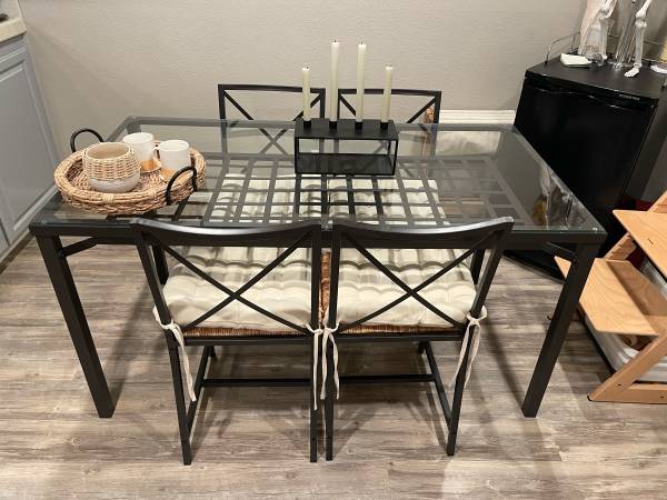 Lightly used black metal table with glass top. 4 chairs included with raffia topping covered with a cream chair cushions. Also included is the candle holder center piece that matches the table.