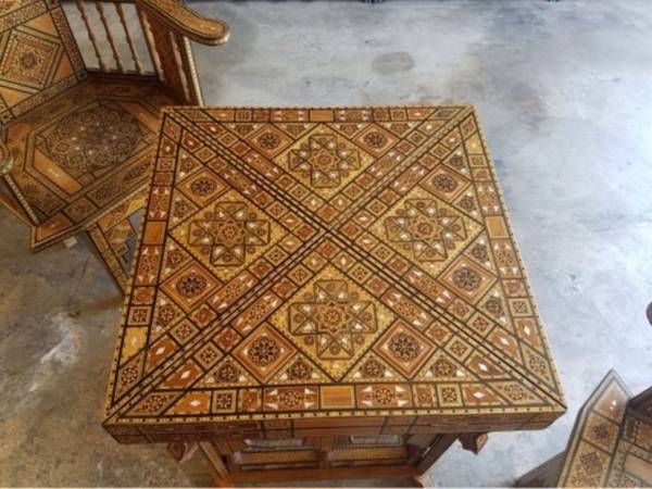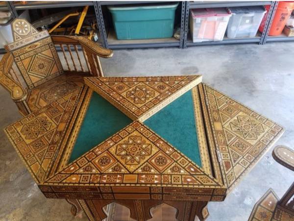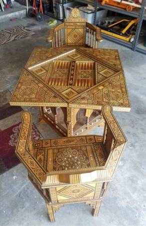 Selling an old Moroccan gaming table with 2 matching chairs. All hand crafted with inlaid woods and mother of pearl. A true work of art. Good for backgammon, chess/checkers, cards or just having...