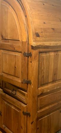 Top & bottom cabinet doors are warped, cabinet doors can be removed & this arched armoire will still look beautiful! Inside top & bottom cabinets have one shelf. Great deep shelving space.
