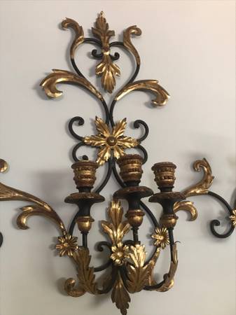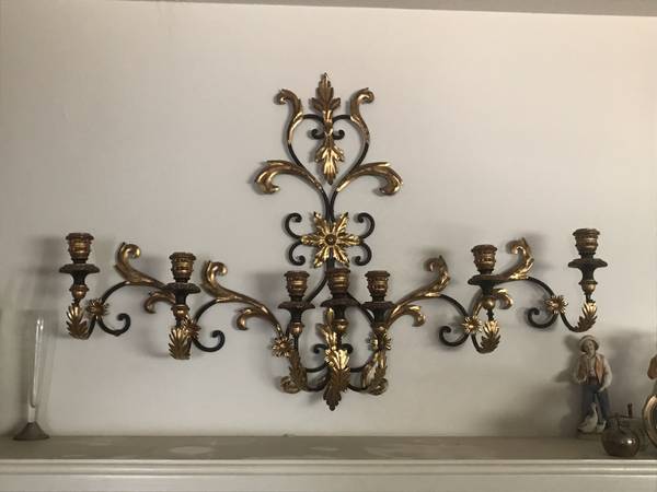 This is a striking mid century Italian gold leaf tole and sculpted iron and gold, monumental seven arm wall sconce. This is a superb wall sconce that is large in size and would look lovely over a bed or mantle. Would be an incredible addition to any Hollywood regency mid century decor. It’s absolutely stunning.
