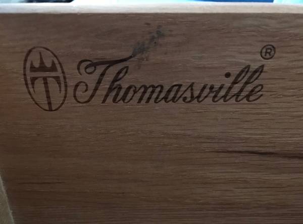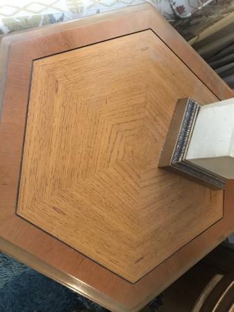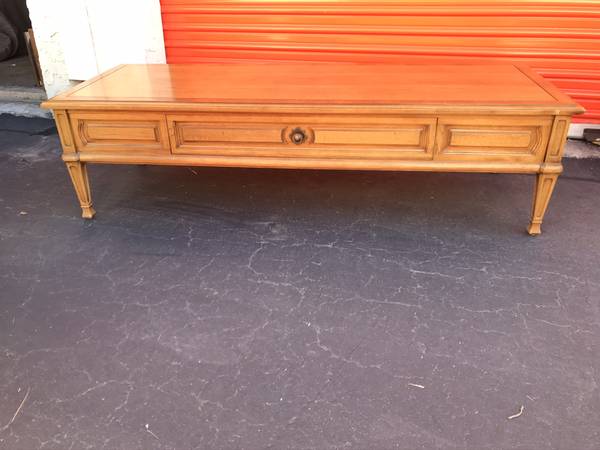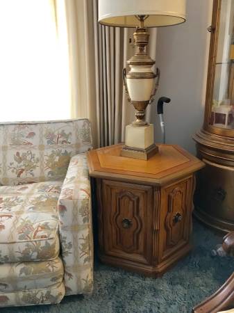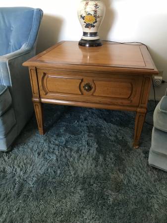 I have three gorgeous pieces of Thomasville mid-century French/Hollywood Regency living room furniture from the Cote Dor collection. There is a geometric hexagon shaped end table with lots of storage, $225. I also have a rectangular end table with a large storage drawer, $225. And I have a rectangular shaped coffee table for $375. These are absolutely gorgeous pieces and extremely well-made, high-end quality solid wood items. These pieces are built to last unlike today’s furniture. There is no particleboard.