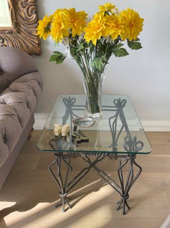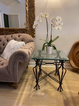 • Solid wood and natural stone coffee table, and end tables with thick beveled glass top and wrought iron base, exuding grandeur for just $295 each (originally $1000 plus).