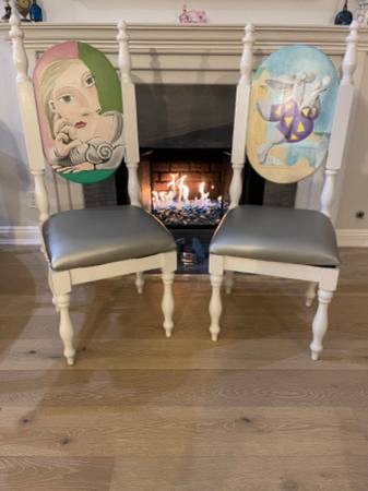 1. Hand-Painted Reclaimed Wood Chairs – Intricately carved and painted with classic artwork.