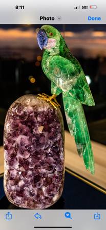 • Hand-carved solid reclaimed wood sculptures and precious stone artworks, including a breathtaking parrot sculpture perched on natural amethyst, garnet, and graphite…