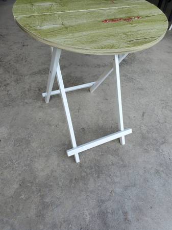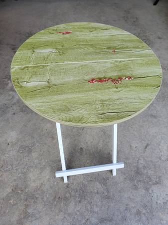 Folding round table, has metal frame and comes with cardboard box. Like new.