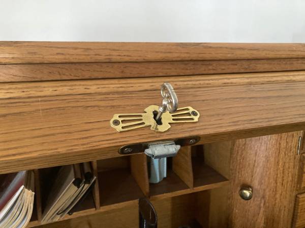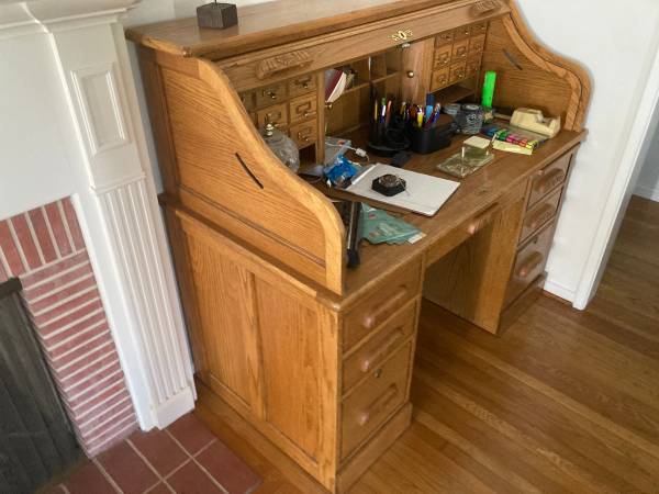 Beautiful oak roll up desk in excellent condition. Pull out drawers and cubbies for storing paperwork. Well taken care of.