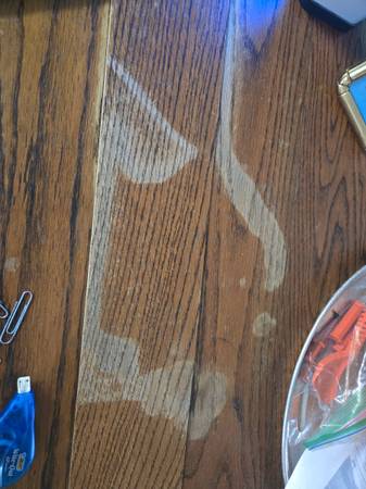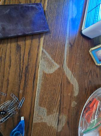 41.5 inch diameter. Table top needs re-gluing. Now a pumpkin has leaked on the table top. Chairs need a good cleaning. Offer???