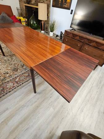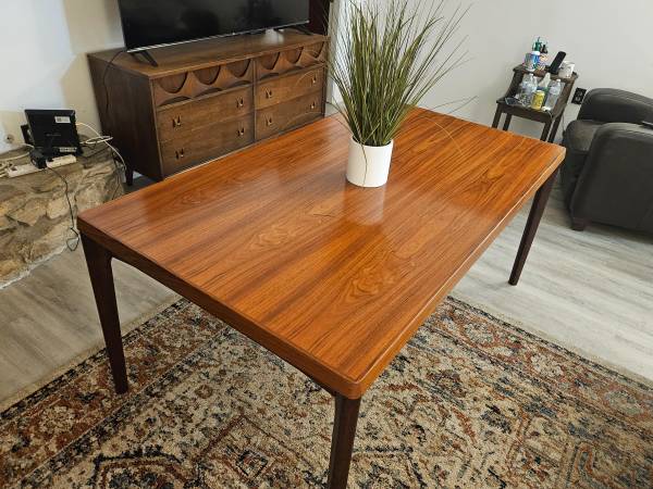 Vintage Mid Century Modern Danish Rosewood extendable dining table by Vejle Stole Mobelfabrik. Very beautiful design with 2 hidden leaves, perfect for entertaining those larger crowds when needed. Table top pads included for added protection. Minor wear consistent with vintage age. Overall good condition. Delivery available for a separate fee. Small deposit required for delivery and holds. No chairs available. @knhgoods for faster response