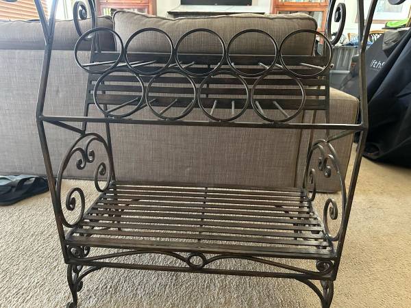 A beautiful wine rack, solid black marble with tannish and gold inlay. Very heavy duty and stylish rod iron with wine bottle holders underneath the marble top and a bottom shelf comprised of heavy iron slats. A Quality piece of decorative and functional furniture. It accents any real nice interior decor.