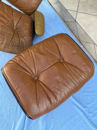 This plycraft lounge chair with ottoman in camel Naugahyde. Very good restored vintage condition, age appropriate wear to upholstery and the chair missing the base.