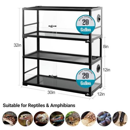 * Professional Design & Materials: CAVACHEW double tier glass tank composed of 2 tanks of 30 x 12 x 12 inches, each tank is 20 gallons, made of high quality tempered glass and aluminum brackets, stand for separate use, design for reptile enthusiasts who have multiple reptiles, suitable for bearded dragons, lizards, snakes, gecko and other reptiles and amphibians.