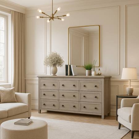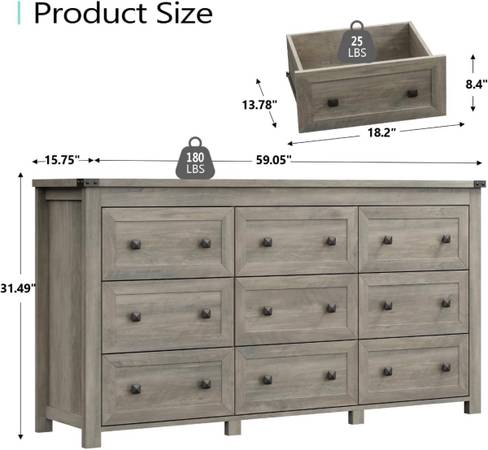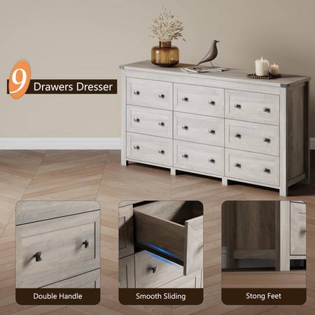 New Dresser for Bedroom with 9 Drawers, Farmhouse Wood Chest of Drawers, Wide TV Stand Closet Storage Furniture with Metal Handle, Modern Clothes Organizer for Hallway, Living Room, Entryway, Light Grey