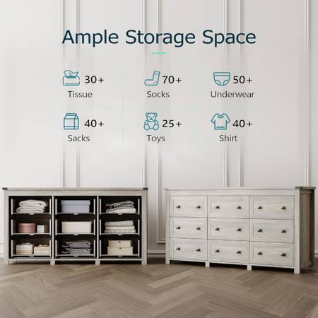 * 【Sturdy & Durable】The farmhouse bedroom dresser is made of durable P2 engineered wood for long-term use and scratch resistant. The thicken dresser legs and anti-tip device made the dresser not slide easily, providing great durability and stability. The top surface of the dresser can hold 180 lbs and each drawer will hold 25 lbs