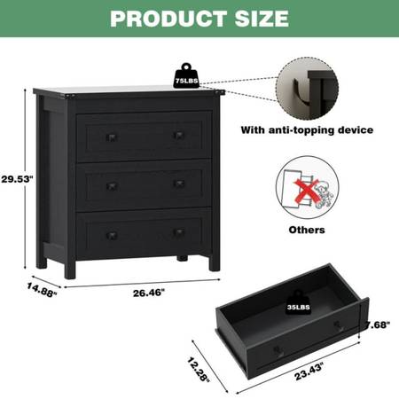 New 3 Large Drawer Nightstand,29.5" Tall Night Stand,27.5" Wide Side Table,Wood Bedside Table Modern End Table,Small Wide Dresser for Bedroom,Black Nightstand