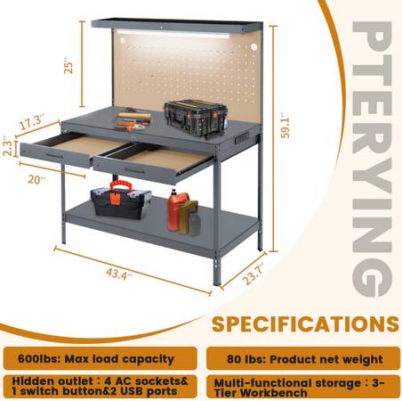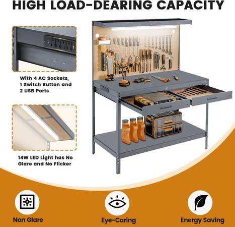 * Outlet with USB Ports: With 4 AC outlets, 1 on/off switch, and 2 USB ports, our pegboard workbench can charge multiple devices to increase your productivity. You can enjoy easy access to 4 standard 3-prong US outlets and fast-charging USB ports.
