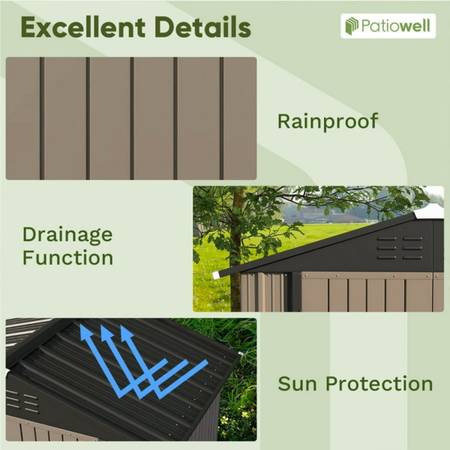 * Drain Roof and Lockable Door: The sloped roof design adds extra storage space while preventing rain or snow from accumulating and causing damage to the material surface or rust, and four vents increase airflow. Door locks keep your belongings safe while preventing other small animals from accidentally entering.