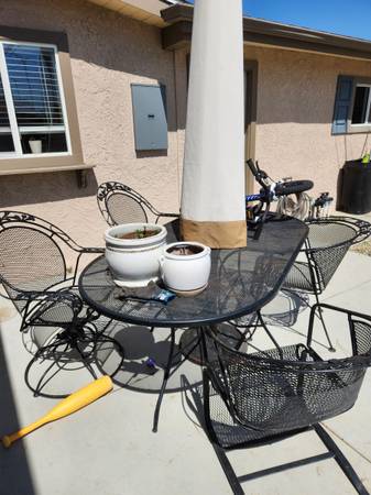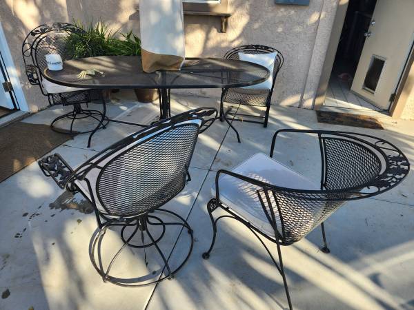 Wrought Iron Patio Set Heavy-duty wrought iron patio set, freshly sprayed with black Rust-Oleum for a sleek, weather-resistant finish. Very sturdy and built to last—no rust, no wobble, just classic...