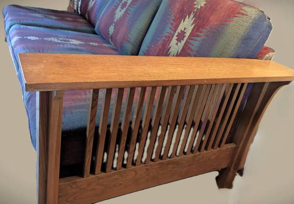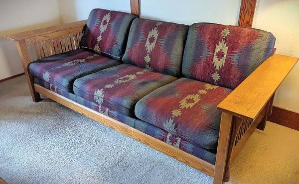 Bassett Oak Mission style sofa (Very Solid). Navajo (Southwestern Patterned Pillows) - Deep red, forest green, gold/tan & dark blue/purple accented. A nice piece for a living room to compliment Mission Style Coffee Table, Chairs, etc.