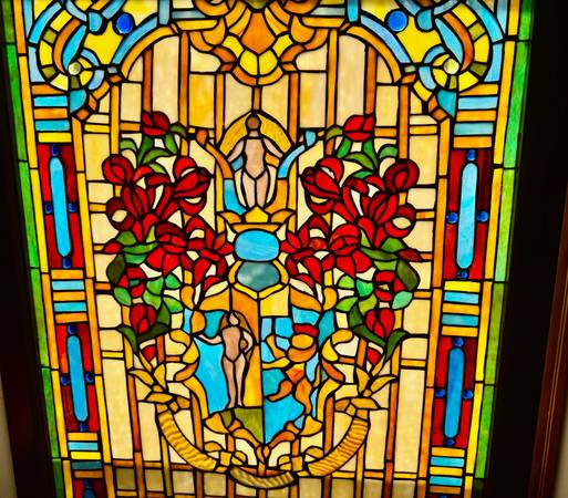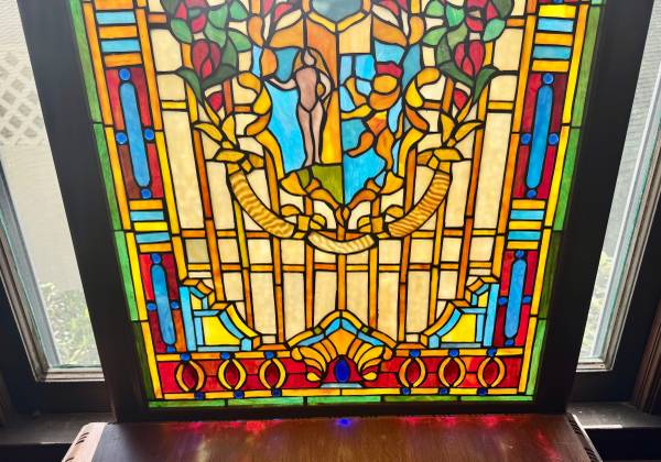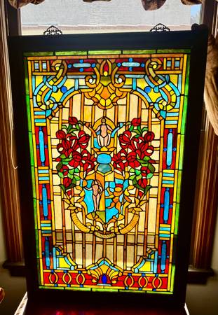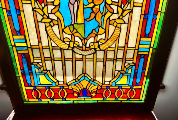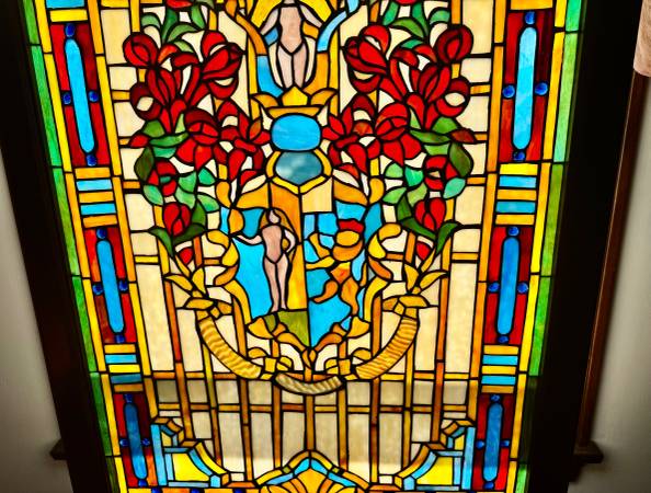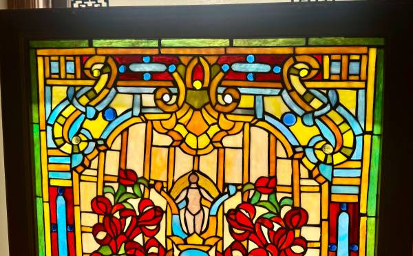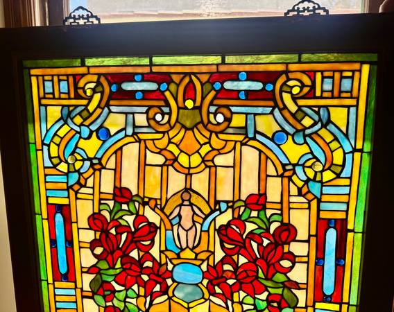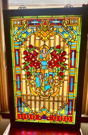 Beautiful Decorative Stained Glass Window Panel; The design features a variety of colors, including red, yellow, blue, and green. No cracks. Very good condition. Check out.