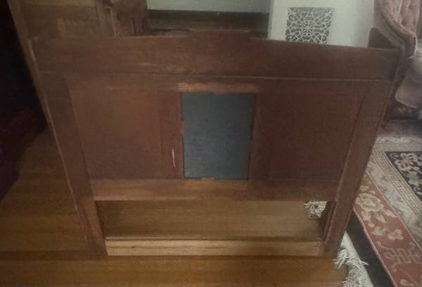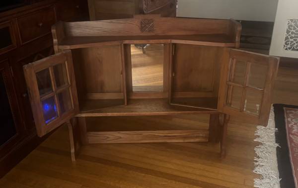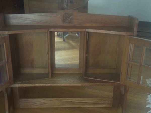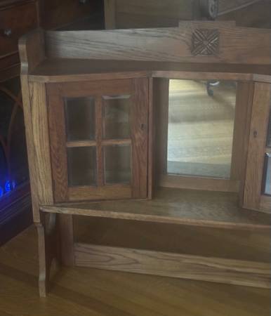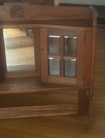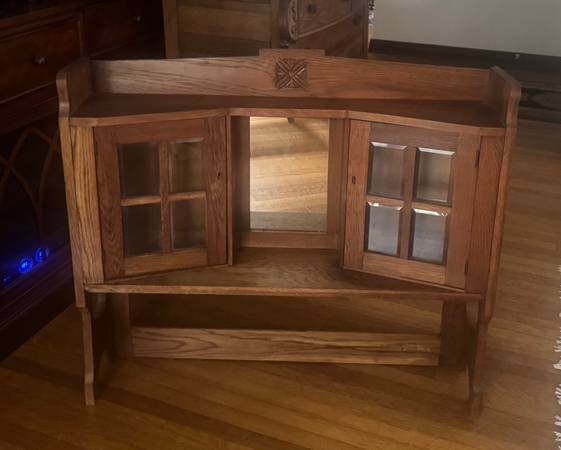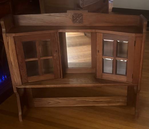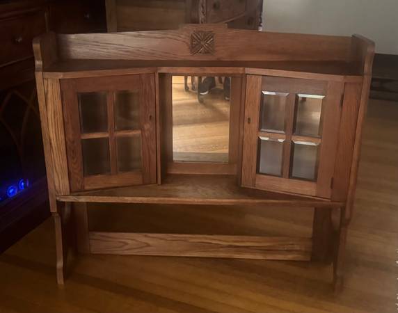Craftsman Countertop Bar / Hanging Bar or Entryway Piece. This is a beautiful vintage craftsman piece with much utility. Hang over a buffet piece with a shelf for an instant bar. Similarly use in an entry way for keys and catchall. You can also rest atop a dresser as a mirrored topper. Nice condition.