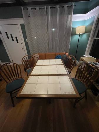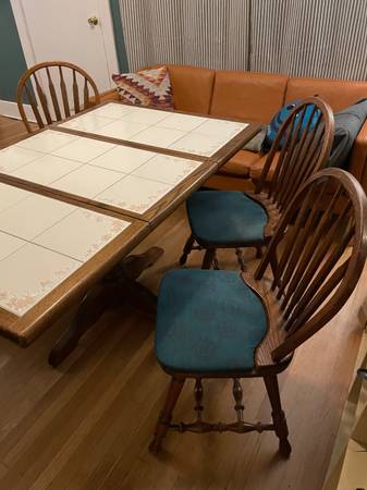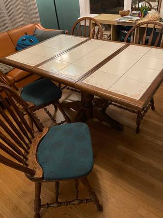 Hi, I'm selling a dining room table including 4 chairs for $75 OBO. I'm buying a new dining room table set so I'm looking to sell this one. High quality tile on the top surface along with wooden...