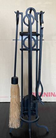 Metal fireplace tools and firewood holder. Tool set in excellent condition. Metal holder for firewood in good condition. Asking $35 for tool set, $10 for wood holder