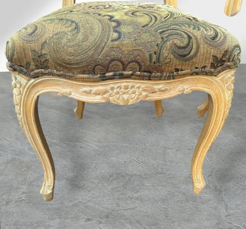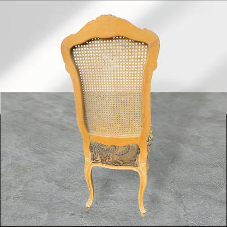 French Provincial Cane Back Wood Dining Side Chairs; wooden with caned backrest. Chairs have carved floral & leaf detail into frame. Very nice condition.