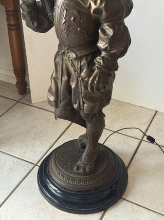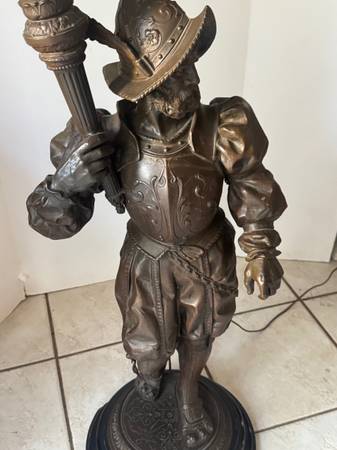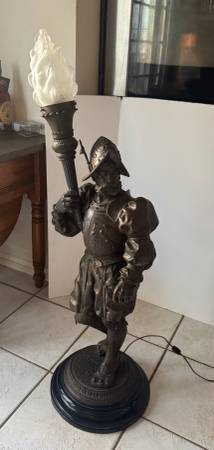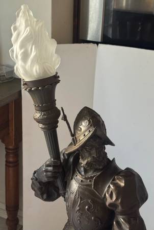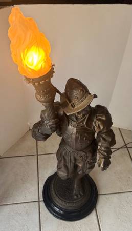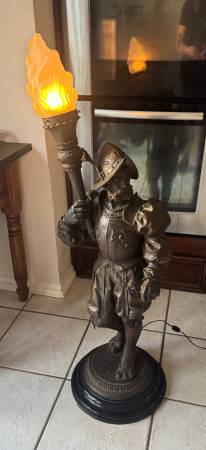 Heavy Metal Floor Lamp 16th-Century Style Warrior or Knight Holding a Flambeau Shade. The lamp can be used as a statement piece and is often used in grand entryways or next to staircases. Excellent condition.