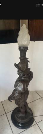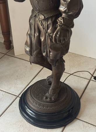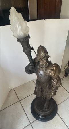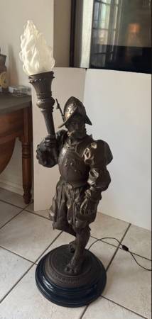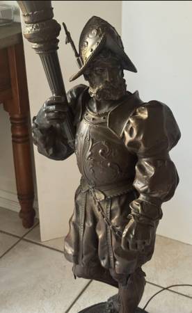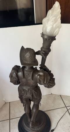 Heavy Metal Floor Lamp 16th-Century Style Warrior or Knight Holding a Flambeau Shade. The lamp can be used as a statement piece and is often used in grand entryways or next to staircases. Excellent condition.