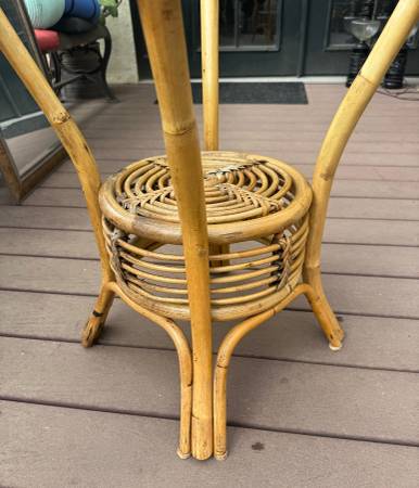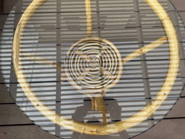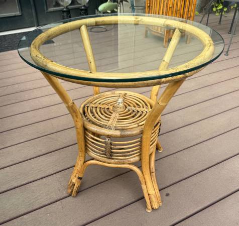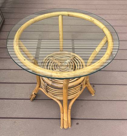 Mid Century Vintage Bent Rattan & Woven Wicker Side Table With Glass Top - 24x24 Mid Century Vintage Bent Rattan & Woven Wicker Side Table With Glass Top. Good condition. Diameter: ~ 24”...