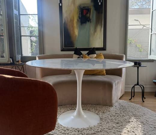 48-inch round Carrara marble top on white cast-metal pedestal base. Eero Saarinen design lineage - DWR purchase. Dimensions: 48 in Ø × 28 H in