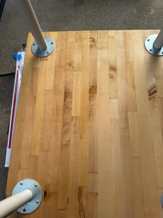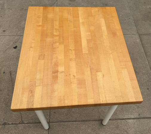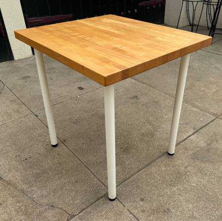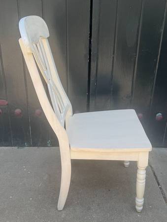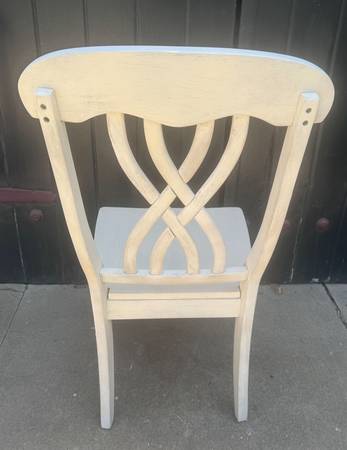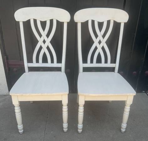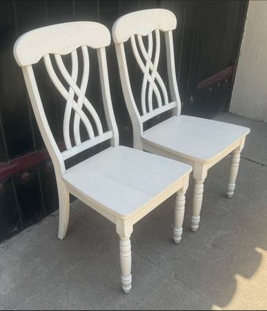 Small Solid Wood Dining Table with Two White Wood Lattice Back Dining Chairs. Good condition. Chairs: Length: ~ 18 ½” Depth: ~ 18” Height: ~ 39” total; ~ 17 ½” from floor to top of seat Table:...