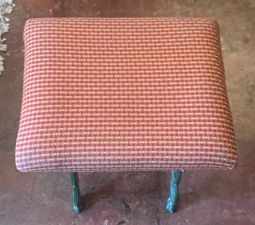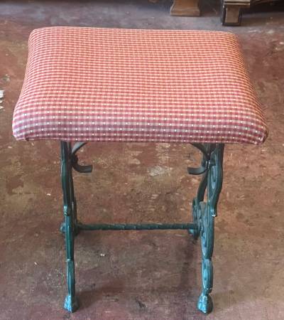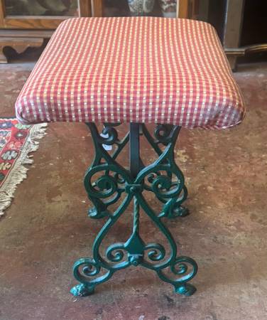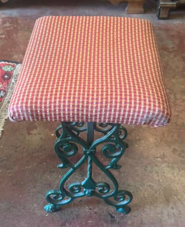 Very Small Antique Wrought Iron Bench; Red, orange, beige top fabric. Good condition. Length: ~ 14 ½” Depth: ~ 12” Height: ~ 17” Price: $105 CASH ONLY Please click on the 'more ads by this user'...