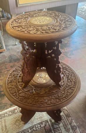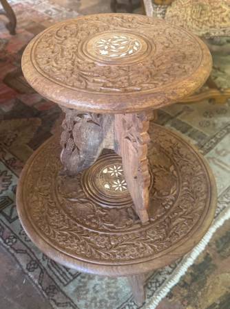 Vintage 1970’s Hand-Carved Indian Wood Tables / Plant Stand. Good condition. Small table: Diameter: ~ 9” Height: ~ 10” Larger table: Diameter: 14” Height: ~ 14” Price: $225 CASH ONLY Please click on...