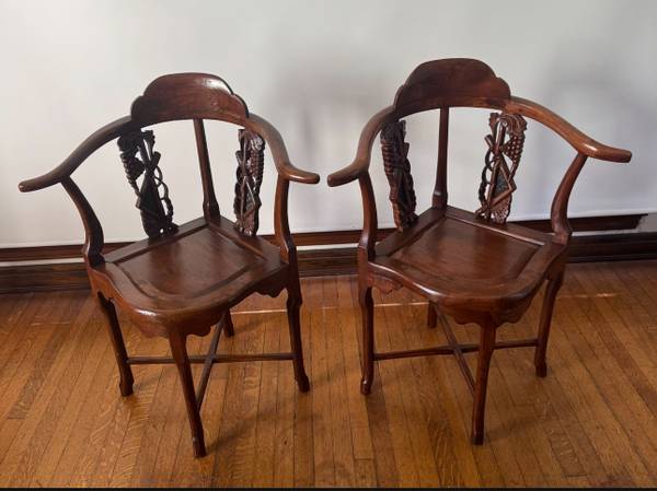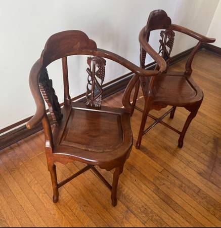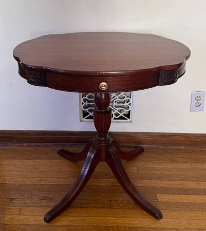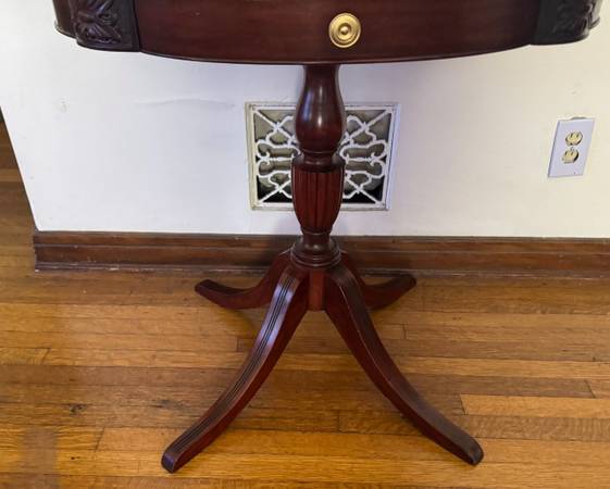 Beautiful Vintage Mahogany Pedestal Drum Center Table with Drawer & Pair of Vintage Ornate Asian Wooden Corner Chairs. Nice condition. Table: Length: ~ 28” Depth: ~ 24” Height: ~ 28” Chairs:...
