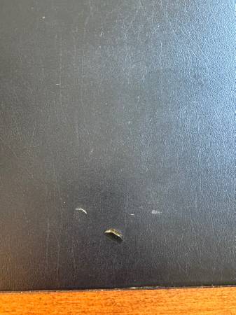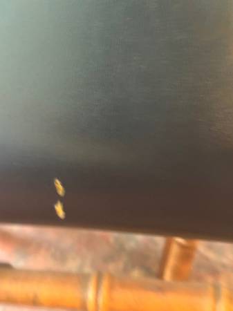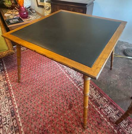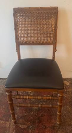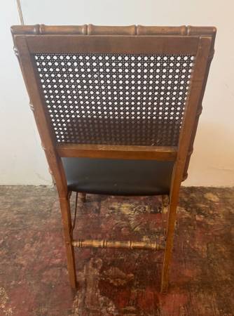 Vintage Stakmore Campaign Style Faux Bamboo Folding Table 4 Chairs Faux Leather. The table and a couple of chairs have small tears (see pictures). Good condition.