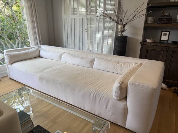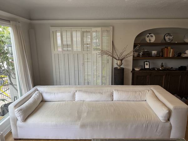 Custom seamless long bench-back sofa in washed linen. Light, elegant profile with deep seat and Restoration Hardware cloud-like comfort. Dimensions: 108 L × 36 D × 30 H in Needs its yearly steam...