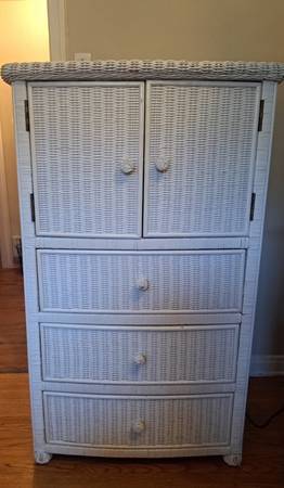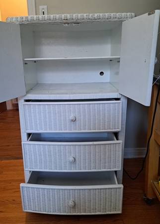 White wicker 3 drawer chest with 2 shelves. GOOD CONDITION. Dimensions: Length: ~ 21” Depth: ~ 18” Height: ~ 50" Price: $300 CASH ONLY Please click on the 'more ads by this user' link to see other...