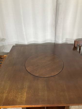Made for today’s modern lifestyle this set does double duty with its integrated Lazy Susan, 4-bottle wine rack and display base for keeping dining essentials at hand. Dine on 4 matching high chairs with brown faux leather cushioned seats. Solid, sturdy construction. Good used condition with normal ware.