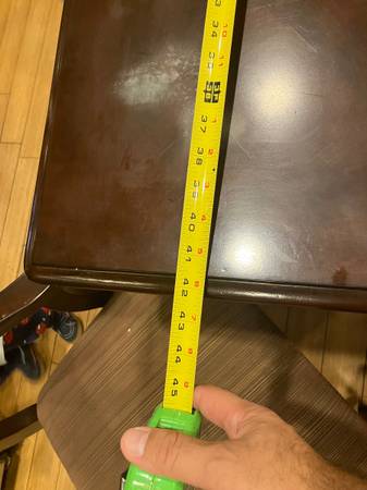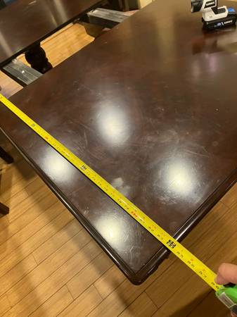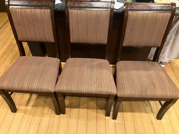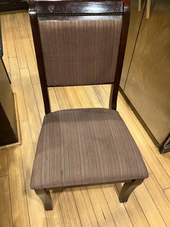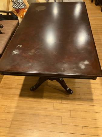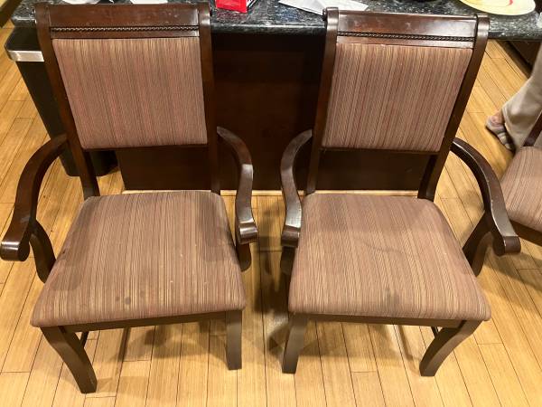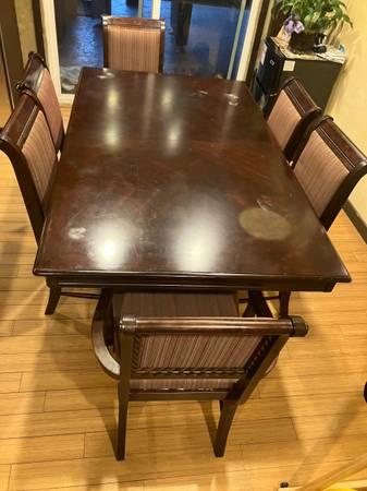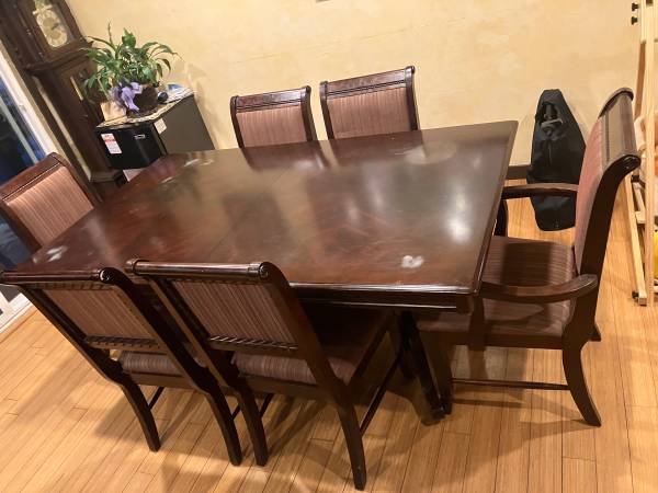 This furniture is about 8 and a half years old. Solid wood. 2 of the chairs have arm rests. Chairs need cleaning or reupholstered. No tears/no rips though. Just dirty from dust and normal usage. The table extends longer with middle section (included with purchase). $300 OBO. I paid over $2,000 for this set back in August of 2017. Needs to go fast!! We want a smaller and round dining table for our home