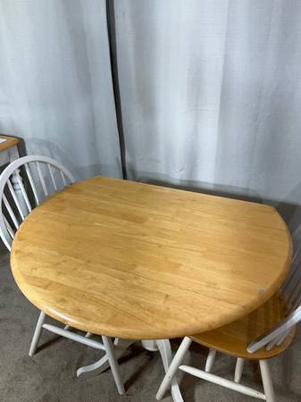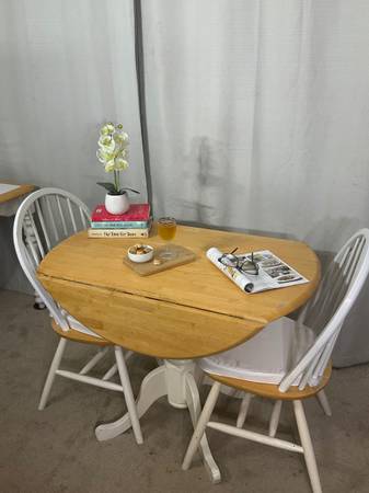Designed with small places in mind this 3-piece dining set offers versatility, style, and comfort in a compact design. From a quick snack, to a full course meal the table adjusts to your needs, with 2 drop leaves. Dine on two Windsor chairs with white seat cushions. Great condition with normal ware that adds character and charm. Hablo español. PRICE IS FIRM