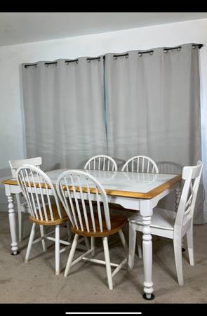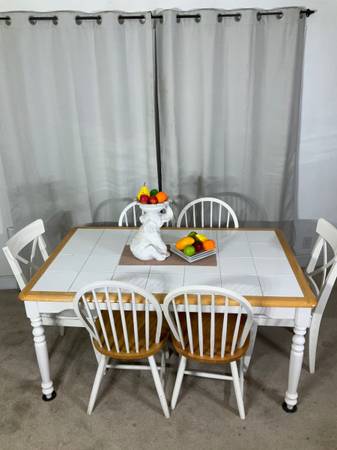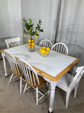 Perfect for those who appreciate an eclectic Country Farmhouse style in their home. Charming 3’ x 5’ table features white inlay tiled top with natural border on white base and turned legs that comfortably fits 6 mixed-matched chairs with your choice of pink or brown seat cushions. Solid, sturdy construction. Great used condition with normal ware that adds character and charm. Hablo español.